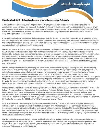 Marsha is an incredibly accomplished and driven individual! As an award-winning entrepreneur and the creator and founder of multiple businesses and a non-profit organization, she has demonstrated remarkable leadership and innovation in her field. Her focus on agri-tourism in West Virginia showcases her commitment to both sustainable business practices and community development.